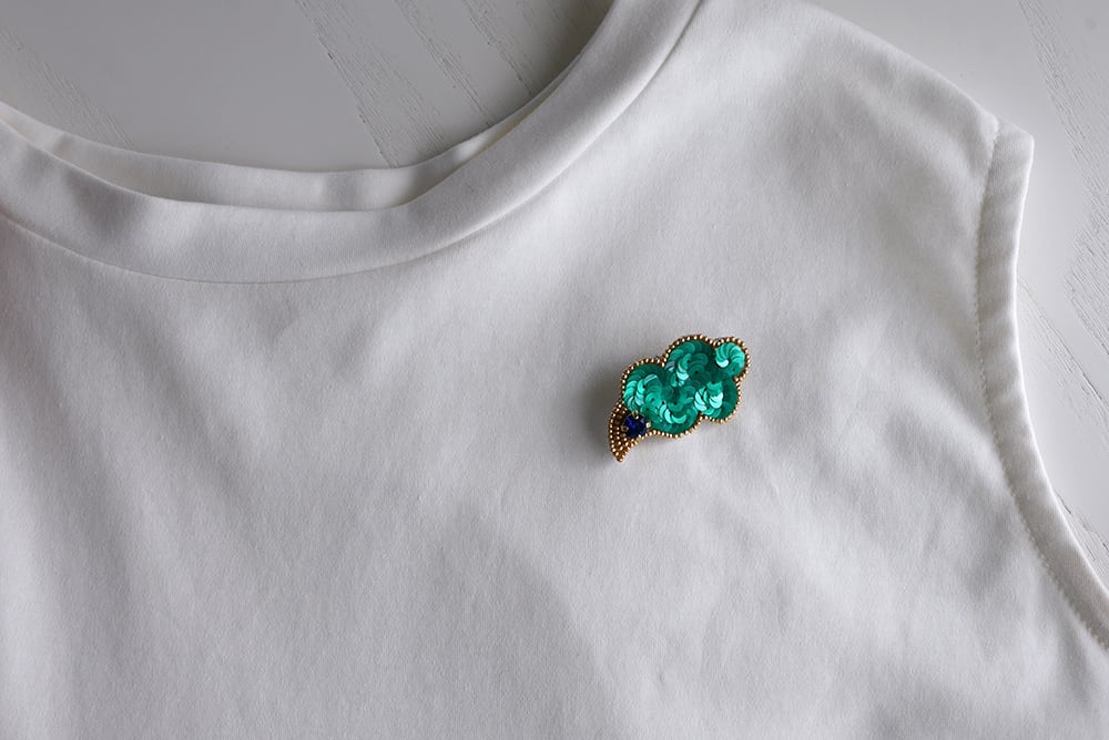 ずっと眺めていられますとのお声をよくいただくHACHIBAKU(ハチバク)のブローチ。光を受けるとキラっと輝くカットが施されているチェコ製ビーズ、つや感が美しいフランス製スパンコールなど、美しく仕上がるよう素材から厳選して作っています。