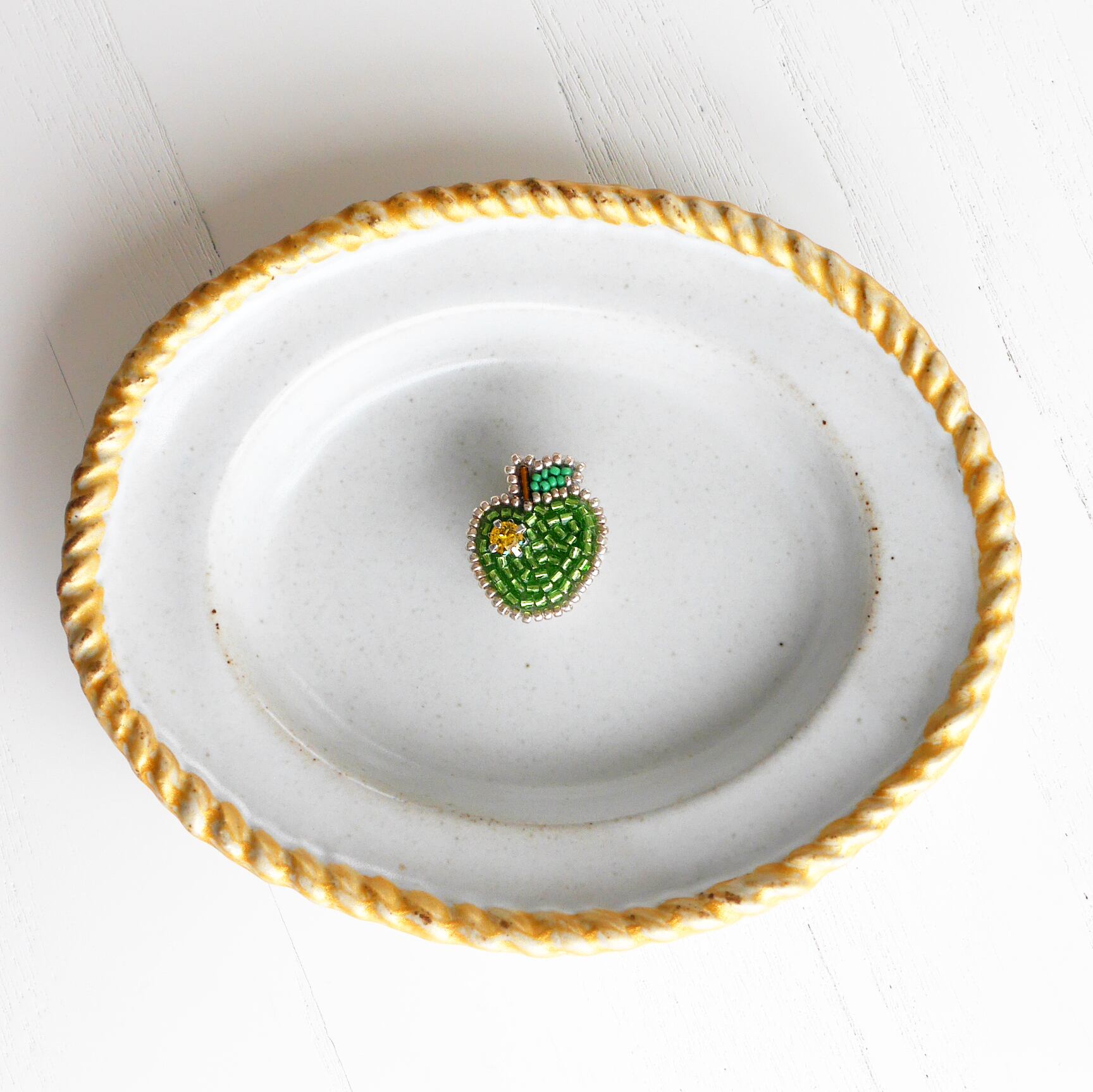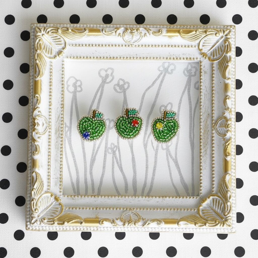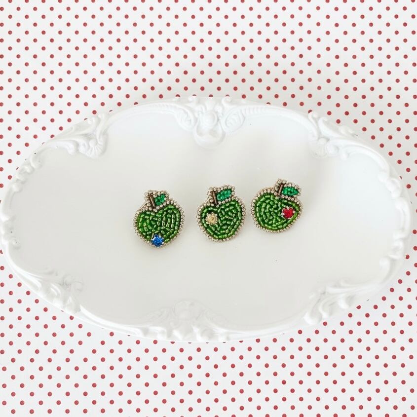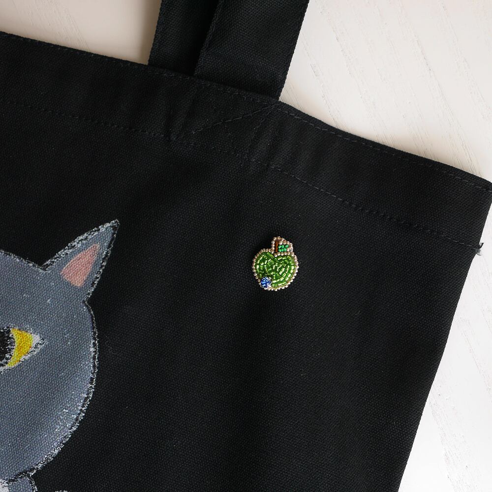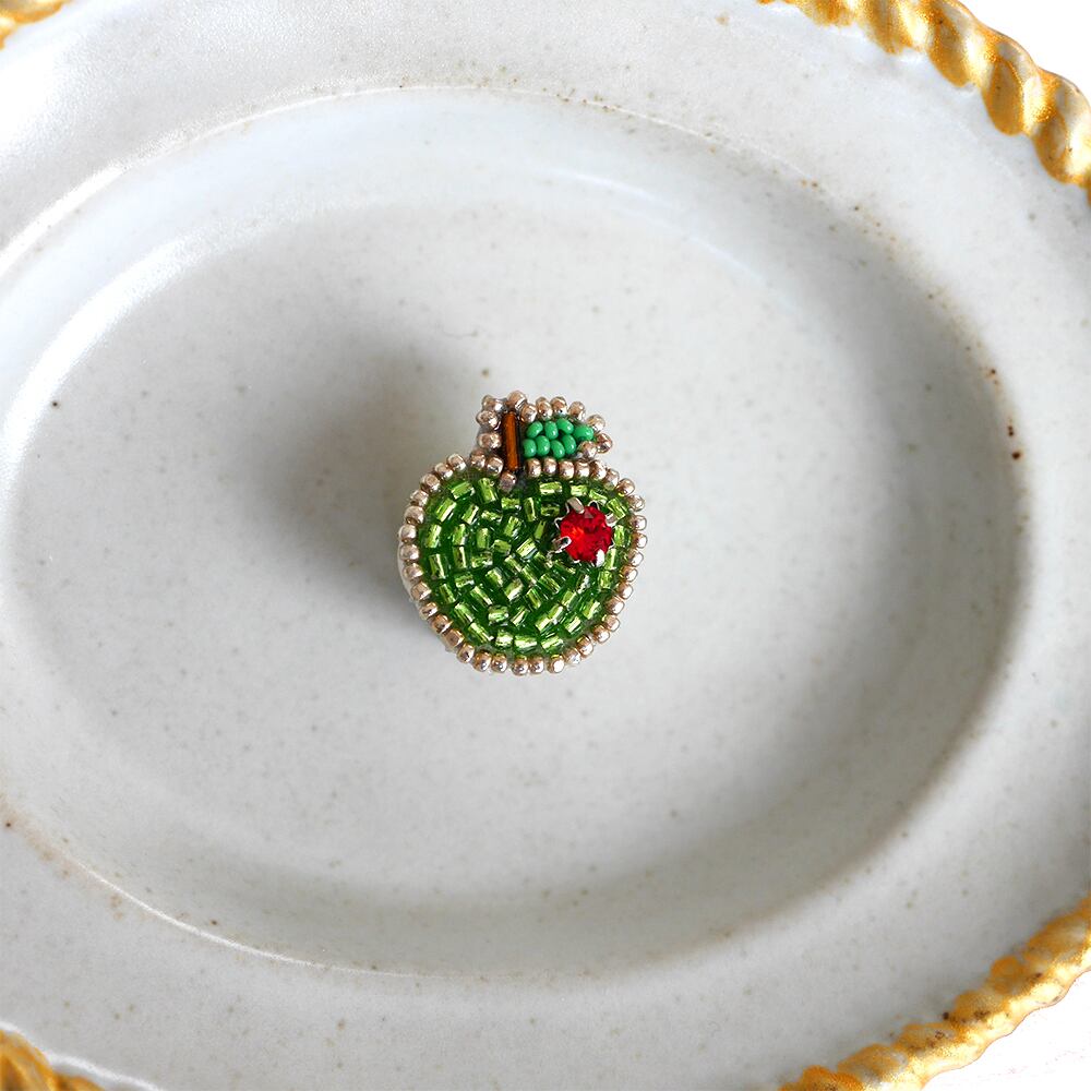 緑のりんごのピンバッチ。